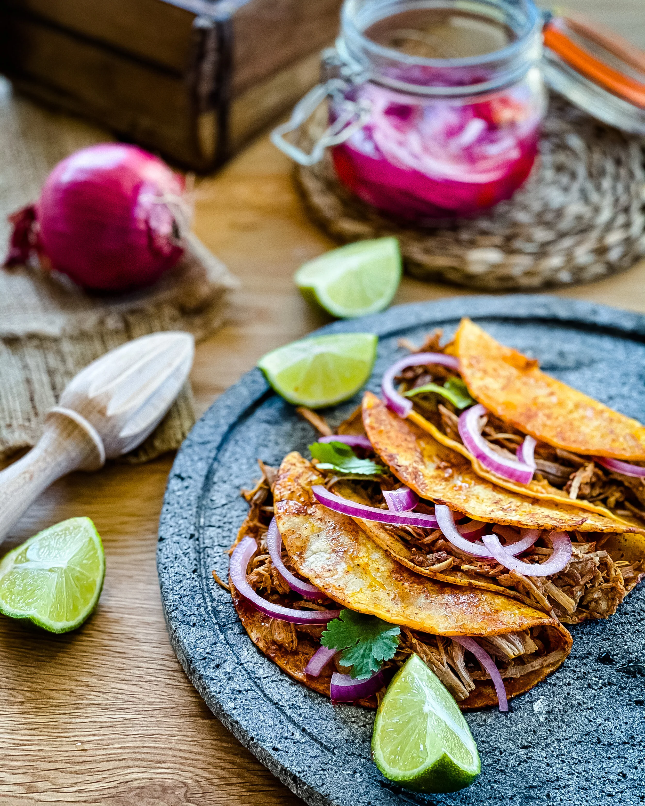 La cochinita pibil es un plato mágico, se come en casa y en restaurantes, se hace mucho en ocasiones especiales y se sirve de muchas maneras: sola, en tacos, en panuchos, con frijoles y hasta en tortas (bocatas), siempre acompañado de cebollas moradas encurtidas, a veces con habanero o chile manzano o en mi caso, fuera de México, que es difícil conseguir buenos chiles, con el que se pueda.